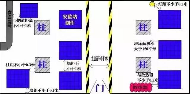 儲存物品與風管、供暖管道、散熱器的距離不應小于0.5米。與供暖機組、風管爐、煙道之間的距離在各個方向上都不應小于1米?!秱}儲場所消防安全管理通則》(GA1131-2014)6.14