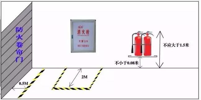 防火卷簾門兩側(cè)各0.5m范圍內(nèi)不得堆放物品,并應用黃色標識線劃定范圍?!度藛T密集場所消防安全管理》(GA654-2006)8.3.7