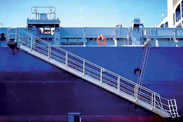根據(jù)新生效的GB/T11701-2021《船用舷梯的基本規(guī)定》(3月1日起施行),舷梯主要分為兩類: (1)旋轉(zhuǎn)平臺式舷梯 單節(jié)舷梯、多節(jié)舷梯或伸縮舷梯的結(jié)構(gòu)與上面的旋轉(zhuǎn)平臺鉸接,可在船與登梯底面之間改變方向和傾斜角度。舷梯可用鋼絲繩或鏈從較低的(各)懸掛點掛住,或用固定在舷梯底部滾柱支持。 (2)固定平臺式舷梯 單節(jié)舷梯、多節(jié)舷梯或伸縮舷梯的結(jié)構(gòu)與上面的固定平臺鉸接,可在船和登梯底面之間改變傾斜角度。舷梯用鋼絲繩或鏈從較低的(各)懸掛點掛住,單獨使用的引航員舷梯采用此固定平臺式舷梯。 根據(jù)SOLAS第II-1章第3-9條款,凡是2010年1月1日及以后建造的船舶,必須在船上安裝經(jīng)認(rèn)可的登/離船設(shè)施,以備在港口或港口相關(guān)操作時使用。 該登/離船設(shè)施必須根據(jù)MSC.1/Circ.1331通函的要求進(jìn)行建造、測試、安裝及維護(hù),主要包括以下八點要求: (1)登/離船設(shè)施應(yīng)遠(yuǎn)離工作區(qū)域以及貨物或其它物體懸掛吊裝時可能通過上方的區(qū)域,該登/離船設(shè)施的目的和使用方式與引水員登 / 離船裝置是不同的; (2)應(yīng)提供足夠的照明,以照亮登/離船設(shè)施、甲板上人員登/離船和裝置控制的位置; (3)當(dāng)?shù)?離船裝置在使用時,在其附近應(yīng)備有一只帶有自亮浮燈和救生浮索的救生圈(注意這里是要求一只救生圈既配備有自亮浮燈又配備有救生浮索,并且處于隨時可用狀態(tài)); (4)每部舷梯應(yīng)具有在其最大操作傾斜角時,下平臺在最輕載水線以上不大于600mm的高度; (5)在每部舷梯或跳板梯的兩端應(yīng)設(shè)置一塊標(biāo)記牌,以清楚顯示安全操作和負(fù)荷限制,包括最大和最小允許設(shè)計傾斜角、設(shè)計負(fù)荷、最大底端板負(fù)荷等,如果最大操作負(fù)荷小于設(shè)計負(fù)荷,則最大操作負(fù)荷也應(yīng)顯示在標(biāo)記牌上; (6)跳板梯使用時安放水平傾斜角不應(yīng)大于30度和舷梯使用時水平傾斜角不應(yīng)大于55度; (7)在人員從登/離船設(shè)施或船舶與碼頭之間可能墜落的舷梯下應(yīng)安放安全網(wǎng); (8)正確設(shè)置舷梯下平臺的安全插銷。 收放前:應(yīng)對升降機械、鋼絲繩、滑車轉(zhuǎn)盤平臺支架等進(jìn)行檢查,確認(rèn)設(shè)備完好,鋼絲、卷筒、吊梁無障礙后方可作業(yè)。 收放過程中: (1)船靠離碼頭收放舷梯過程中,應(yīng)有專人指揮,作業(yè)人員默契配合。在浮動的梯子上進(jìn)行收起、安裝欄桿、護(hù)繩作業(yè)時,應(yīng)先檢查平臺支架是否已可靠支好,并使用止蕩索,上舷梯操作人員必須系好安全帶,穿好救生衣。 (2)舷梯落岸下踏板應(yīng)避開障礙物,安放平穩(wěn),嚴(yán)禁扭曲。吊梁、鏈條要注意絞高或安放妥當(dāng),以免碰頭和妨礙上下船。 (3)由于潮夕、裝卸貨、碼頭環(huán)境等因素影響,舷梯不能放置碼頭時,要注意隨時調(diào)整舷梯高度。當(dāng)舷梯下踏板離碼頭較高較遠(yuǎn)時,不允許勉強上下。梯口值班人員負(fù)責(zé)調(diào)整舷梯和提醒上下人員注意安全,必要時應(yīng)按規(guī)定加裝橋梯。 (4)由于漲落潮、移泊等原因需要松緊纜繩時,應(yīng)絞起舷梯,收起橋梯,或?qū)H丝春锰菘诮谷藛T上下。在無法使用舷梯時,要正確地搭設(shè)橋梯,必須綁扎牢固、裝妥扶手、掛好安全網(wǎng)后人員方可上下。禁止從船舷直接跳上碼頭,或從碼頭直接跳上船。 (5)舷梯、橋梯必須按規(guī)定張掛安全網(wǎng)。舷梯、橋梯處應(yīng)有防墜落、防滑等安全指示標(biāo)志。舷梯、橋梯的扶手、扶繩、階梯必須保持清爽、干凈、牢固,便于上下人員抓牢、踏實。 (6)禁止用舷梯吊運物品,禁止超載。