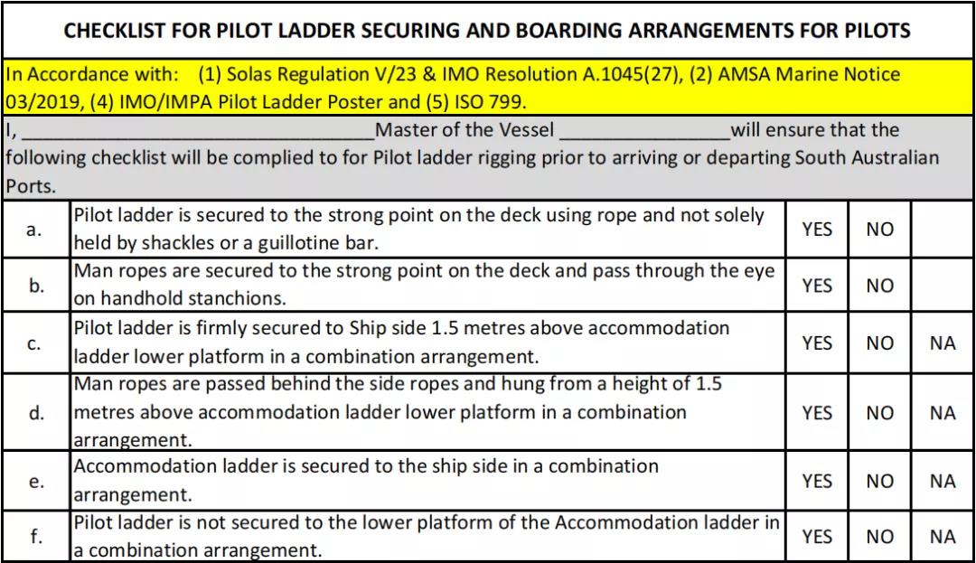 ·在抵達南澳大利亞港口之前,所有船長都應填寫隨附的引航梯固定和登船安排清單。