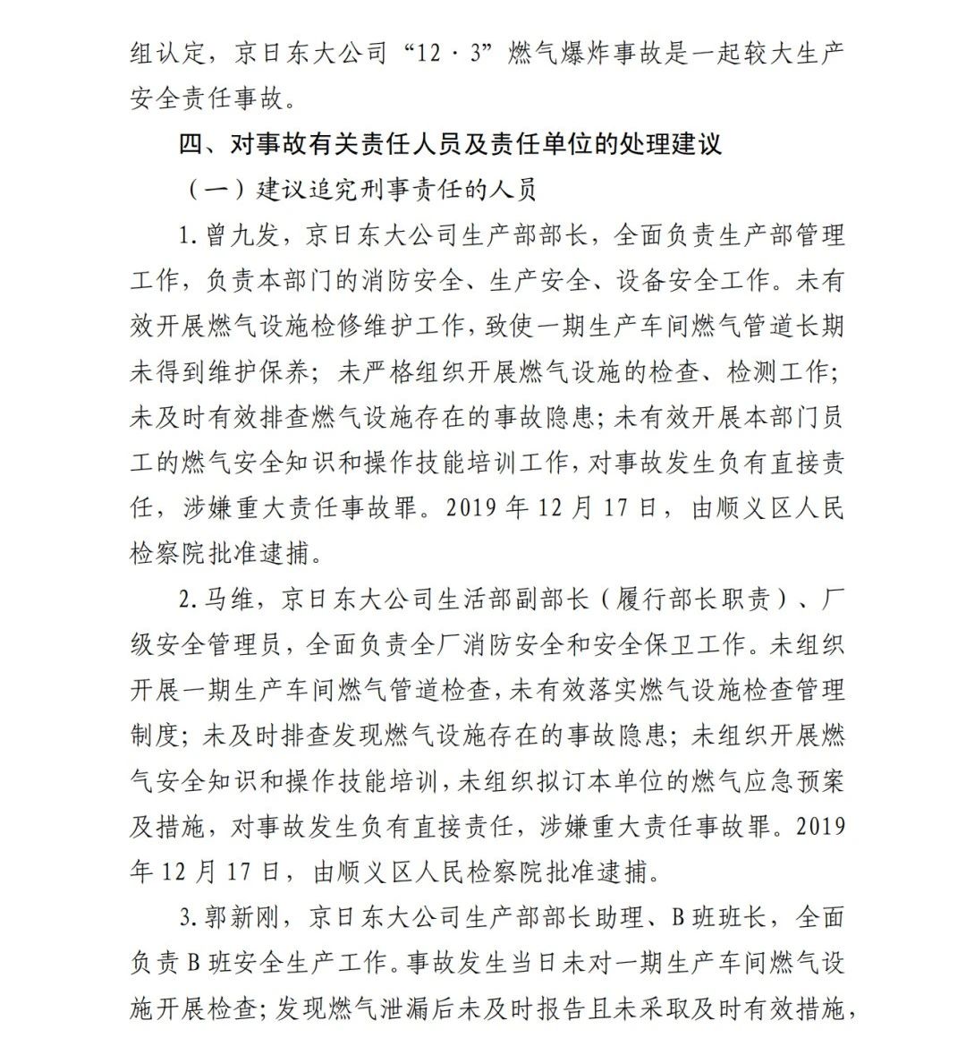 3.郭新剛,京日東大公司生產(chǎn)部部長助理、B 班班長,全面負(fù)責(zé) B 班安全生產(chǎn)工作。事故發(fā)生當(dāng)日未對一期生產(chǎn)車間燃?xì)庠O(shè)施開展檢查;發(fā)現(xiàn)燃?xì)庑孤┖笪醇皶r(shí)報(bào)告且未采取及時(shí)有效措施,14對事故發(fā)生負(fù)有直接責(zé)任,涉嫌重大責(zé)任事故罪。2019 年 12 月 17 日,由順義區(qū)人民檢察院批準(zhǔn)逮捕。