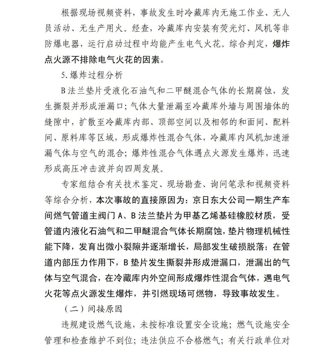 本次事故的直接原因?yàn)椋?/span>京日東大公司一期生產(chǎn)車間燃?xì)夤艿乐鏖y門A、B法蘭墊片為甲基乙烯基硅橡膠材質(zhì),受管道內(nèi)液化石油氣和二甲醚混合氣體長期腐蝕,墊片物理機(jī)械性能下降,發(fā)育出微小裂隙并逐漸增長,局部發(fā)生破損脫落;在管道內(nèi)部壓力作用下,B墊片發(fā)生撕裂并形成泄漏口,泄漏出的氣體與空氣混合,在冷藏庫內(nèi)外空間形成爆炸性混合氣體,遇電氣火花等點(diǎn)火源發(fā)生爆炸,并引燃現(xiàn)場可燃物,導(dǎo)致事故發(fā)生。
