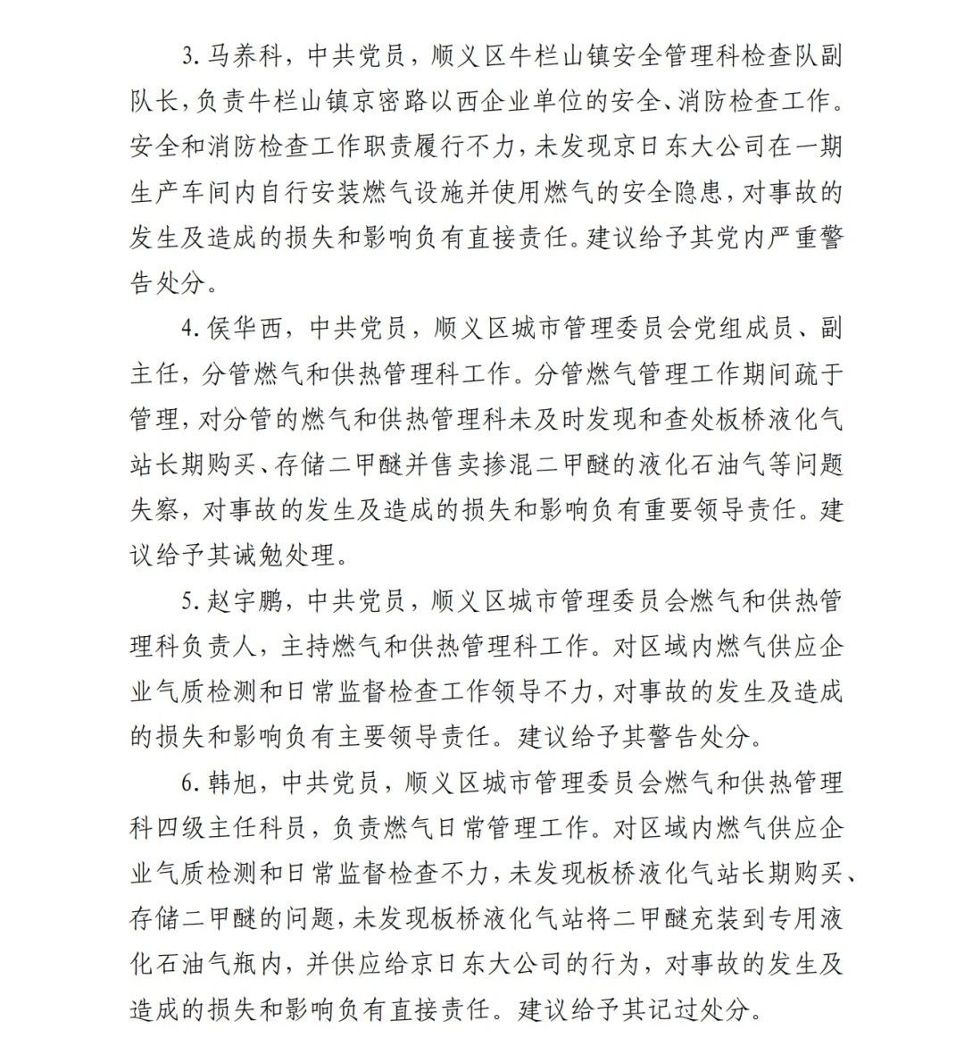 4.方勇忠,曾先后擔(dān)任京日東大公司生活部副部長兼設(shè)備部部長助理、設(shè)備部部長、生產(chǎn)部部長兼設(shè)備部部長、總經(jīng)理助理(2019年4月辭職)。2006年負(fù)責(zé)京日東大公司一期生產(chǎn)車間建設(shè)工作,期間未委托具有相應(yīng)資質(zhì)的施工單位,組織本單位人員自行建設(shè)安裝燃?xì)庠O(shè)施,導(dǎo)致燃?xì)庠O(shè)施安全隱患長期存在;2018 年負(fù)責(zé)一期生產(chǎn)車間內(nèi)新建冷藏庫建設(shè),將部分管道、閥門等燃?xì)庠O(shè)施封閉在通風(fēng)不良的場所內(nèi),且未設(shè)置通風(fēng)、燃?xì)庑孤﹫?bào)警等安全設(shè)施,對事故發(fā)生負(fù)有直接責(zé)任,涉嫌重大責(zé)任事 故罪。2020 年 1 月 23 日被順義公安分局刑事拘留,2 月 6 日取 保候?qū)?,建議依法追究刑事責(zé)任。