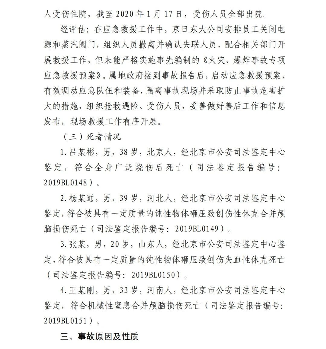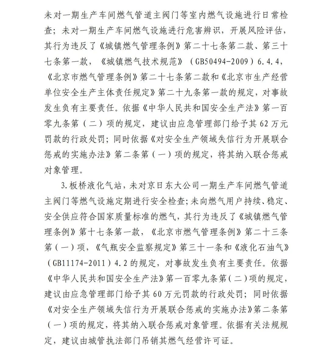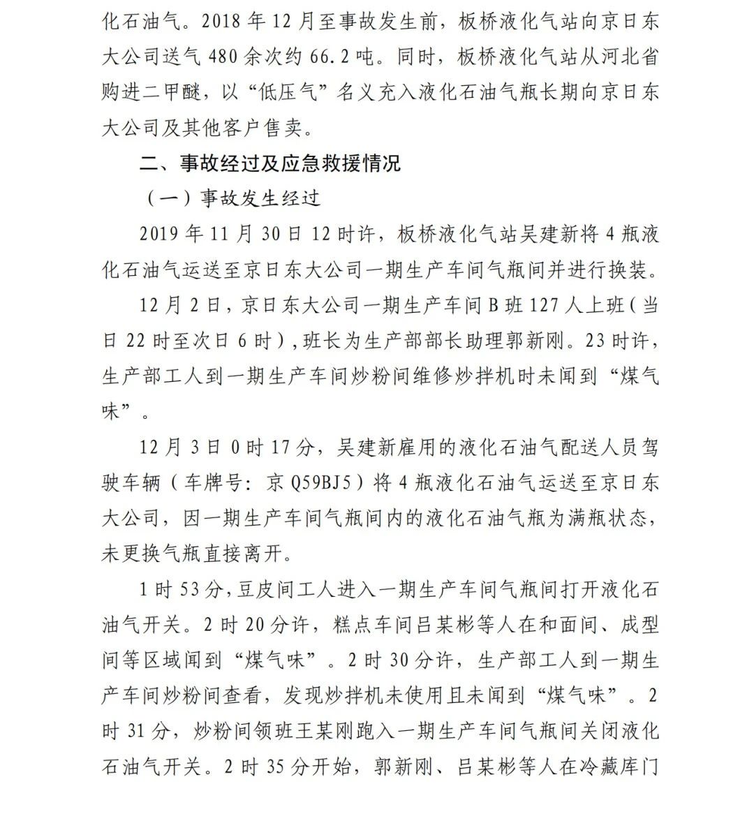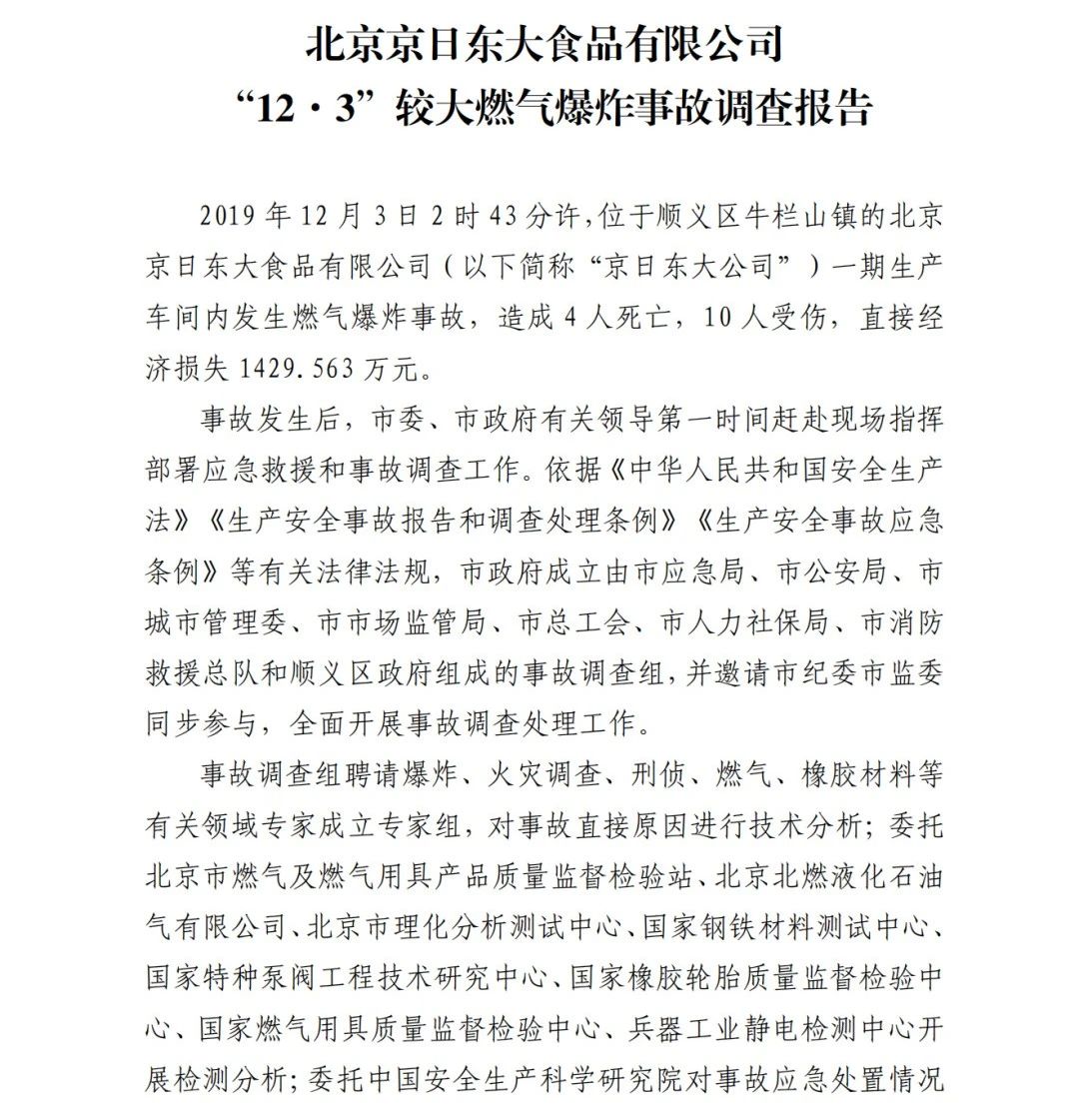 2019年12月3日2時(shí)43分許,北京順義區(qū)牛欄山鎮(zhèn)的(以下簡稱“京日東大公司”)一期生產(chǎn)車間內(nèi)發(fā)生燃?xì)獗ㄊ鹿剩斐?人死亡,10人受傷,直接經(jīng)濟(jì)損失1429.563萬元。