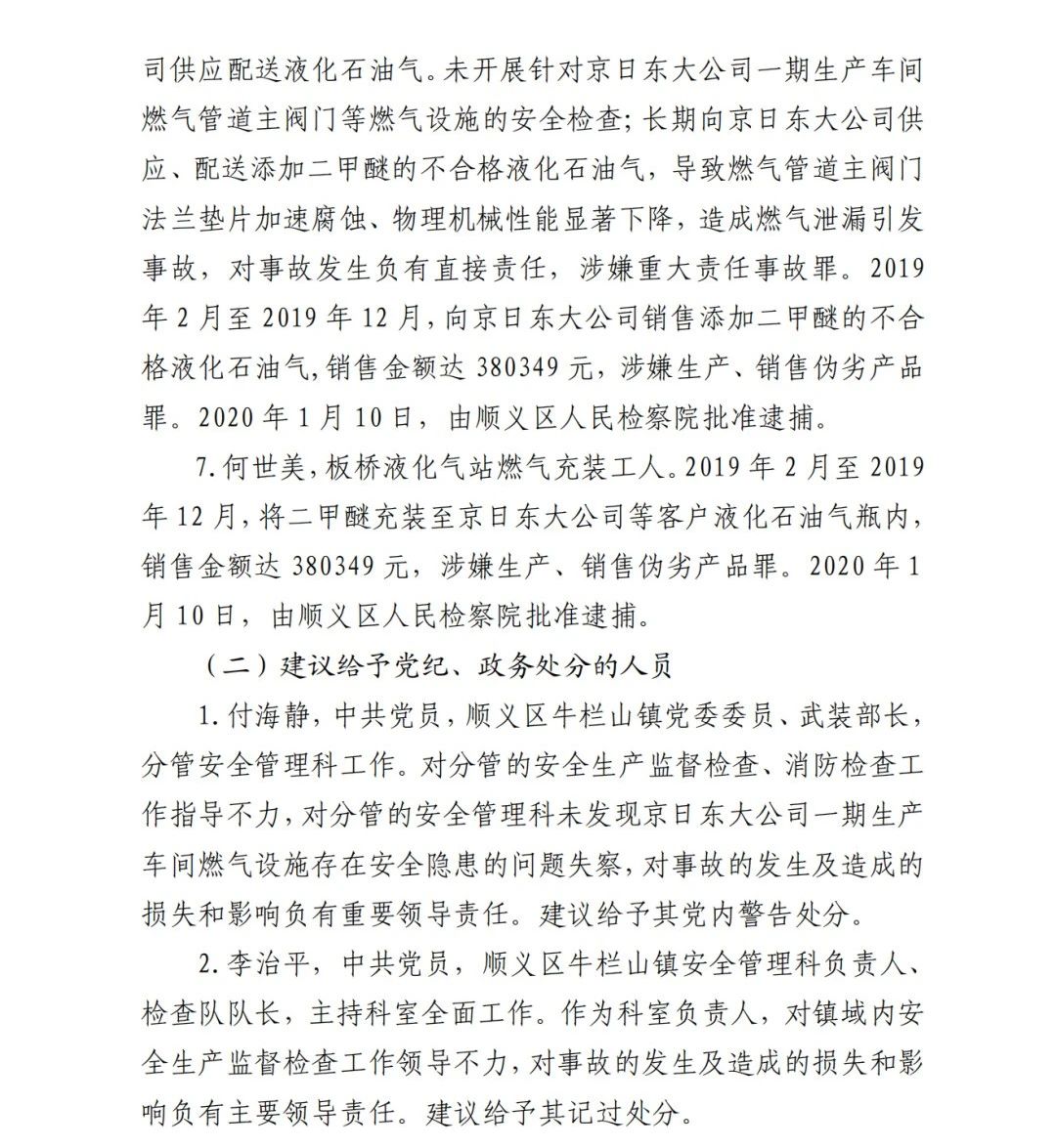 6.吳建新,板橋液化氣站工作人員,具體負(fù)責(zé)向京日東大公15司供應(yīng)配送液化石油氣。未開展針對京日東大公司一期生產(chǎn)車間燃?xì)夤艿乐鏖y門等燃?xì)庠O(shè)施的安全檢查;長期向京日東大公司供應(yīng)、配送添加二甲醚的不合格液化石油氣,導(dǎo)致燃?xì)夤艿乐鏖y門法蘭墊片加速腐蝕、物理機(jī)械性能顯著下降,造成燃?xì)庑孤┮l(fā) 事故,對事故發(fā)生負(fù)有直接責(zé)任,涉嫌重大責(zé)任事故罪。2019 年 2 月至 2019 年 12 月,向京日東大公司銷售添加二甲醚的不合 格液化石油氣,銷售金額達(dá) 380349 元,涉嫌生產(chǎn)、銷售偽劣產(chǎn)品 罪。2020 年 1 月 10 日,由順義區(qū)人民檢察院批準(zhǔn)逮捕。