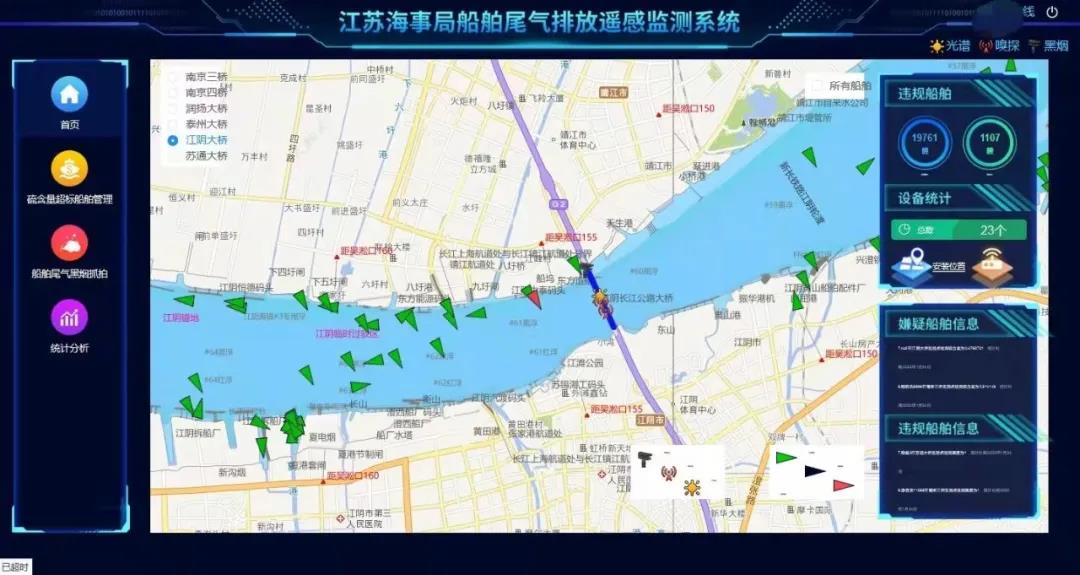 在長江江陰段轄區(qū),依托江陰長江大橋架設(shè)了3套采用光譜、嗅探等不同工作原理的硫含量監(jiān)測、黑煙抓拍等專業(yè)設(shè)備,船舶尾氣排放遙感監(jiān)測系統(tǒng)成為江陰海事局深化建設(shè)船舶污染防治“江蘇模式”江陰樣板區(qū)、精準(zhǔn)防治船舶尾氣污染、助力打贏藍(lán)天保衛(wèi)戰(zhàn)的科技利器。