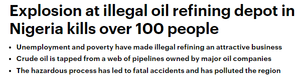非法原油煉制產(chǎn)業(yè)有著致命后果,這些原油通常都是從大型石油業(yè)者們縱橫交錯的管線接取, 在簡陋儲槽煉制成油品. 程序復(fù)雜而危險(xiǎn), 已經(jīng)造成了許多致命意外事故,。