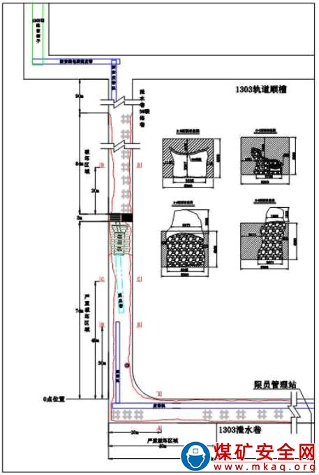1303 工作面泄水巷與 3 號(hào)聯(lián)絡(luò)巷拐點(diǎn)以外 100 米巷道,拐點(diǎn)向上 74 米巷道,共 174 米巷道出現(xiàn)不同程度破壞,其中嚴(yán)重段為拐點(diǎn)以外 40 米巷道及拐點(diǎn)向上 74 米巷道,共計(jì) 114 米;3 號(hào)聯(lián)絡(luò)巷貫通點(diǎn)向上 174 米巷道出現(xiàn)不同程度破壞,其中嚴(yán)重段為貫通點(diǎn)以上 84 米巷道。破壞巷道共計(jì) 348 米,其中嚴(yán)重破壞段為198 米。巷道破壞位置見圖 4,具體情況如下: