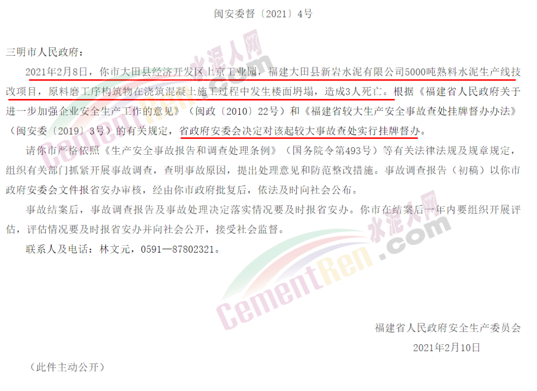 據(jù)水泥人網(wǎng)了解,福建省應(yīng)急管理廳發(fā)布較大生產(chǎn)安全事故查處掛牌督辦通知書(三明大田2.8水泥技改項(xiàng)目施工過(guò)程樓面坍塌事故)稱,2021年2月8日,三明市大田縣經(jīng)濟(jì)開(kāi)發(fā)區(qū)上京工業(yè)園,福建大田縣新巖水泥有限公司5000噸熟料水泥生產(chǎn)線技改項(xiàng)目,原料磨工序構(gòu)筑物在澆筑混凝土施工過(guò)程中發(fā)生樓面坍塌,造成3人死亡。 依據(jù)有關(guān)規(guī)定,福建省政府安委會(huì)決定對(duì)該起較大事故查處實(shí)行掛牌督辦。