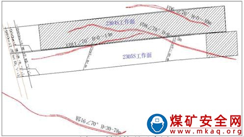 FD6 斷層:位于 2019 年已推采完畢的 2304S 工作面北部,正斷層,落差 0~10m,傾角 70°,傾向 SE,走向 NE,斷層在2304S 工作面延展長(zhǎng)度 400m。