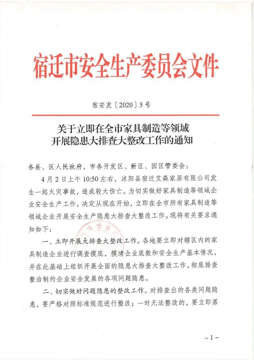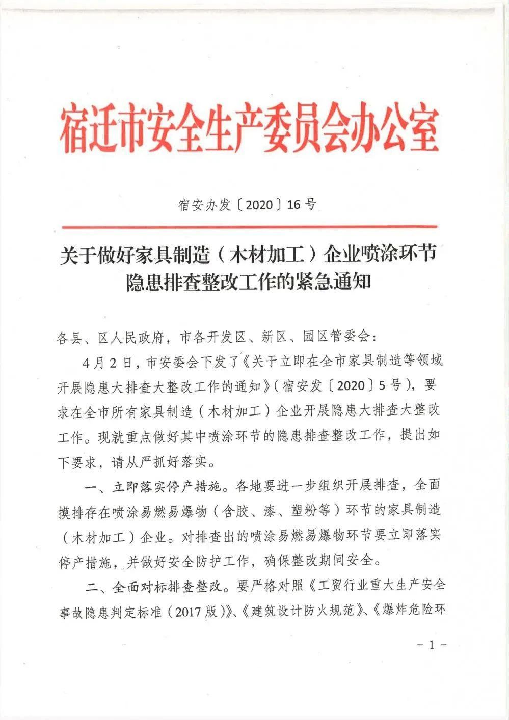 宿遷安監(jiān)消息:近日,宿遷市安委會(huì)連續(xù)發(fā)出5號(hào)、6號(hào)文件,安委辦發(fā)出16號(hào)文件,要求開展專項(xiàng)治理。安委辦16號(hào)文件特別提出要重點(diǎn)做好家具制造噴涂環(huán)節(jié)的隱患排查整改工作。