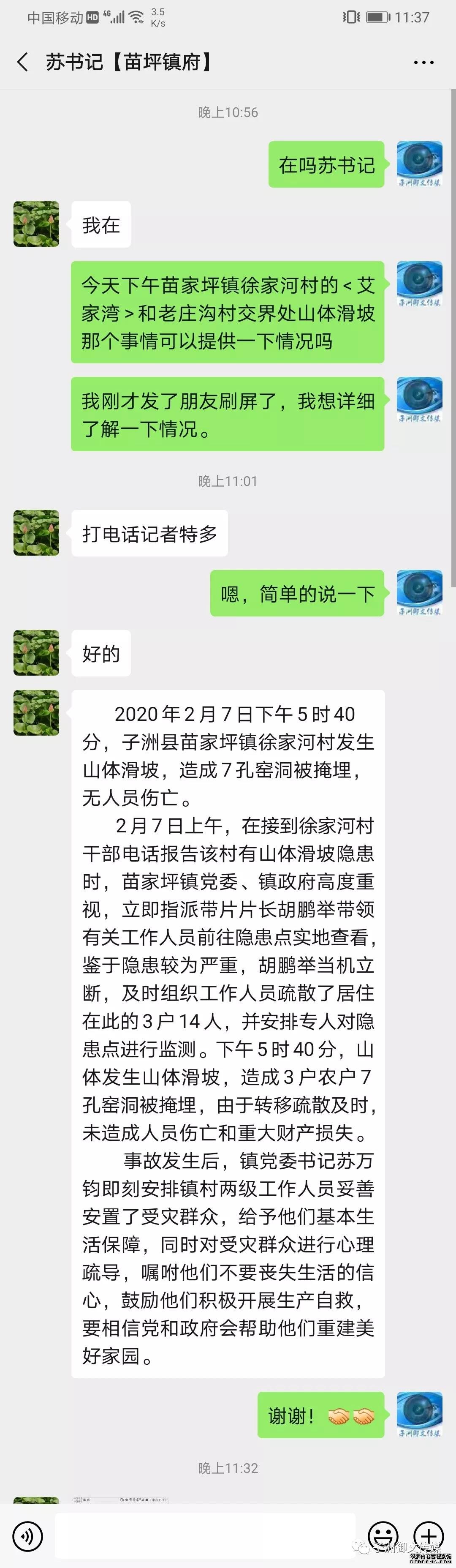 2月7日上午,在接到徐家河村干部電話報告該村有山體滑坡隱患時,苗家坪鎮(zhèn)黨委、鎮(zhèn)政府高度重視,立即指派帶片片長胡鵬舉帶領(lǐng)有關(guān)工作人員前往隱患點實地查看,鑒于隱患較為嚴重,胡鵬舉當機立斷,及時組織工作人員疏散了居住在此的3戶14人,并安排專人對隱患點進行監(jiān)測。下午5時40分,山體發(fā)生山體滑坡,造成3戶農(nóng)戶7孔窯洞被掩埋,由于轉(zhuǎn)移疏散及時,未造成人員傷亡和重大財產(chǎn)損失。