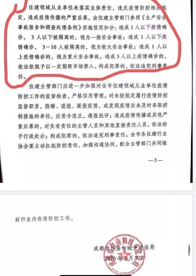 2月7日,成都市住房和城鄉(xiāng)建設局發(fā)布了《關于將新型冠狀病毒感染的肺炎疫情防控工作納入住建領域市場主體信用評價管理的通知》。