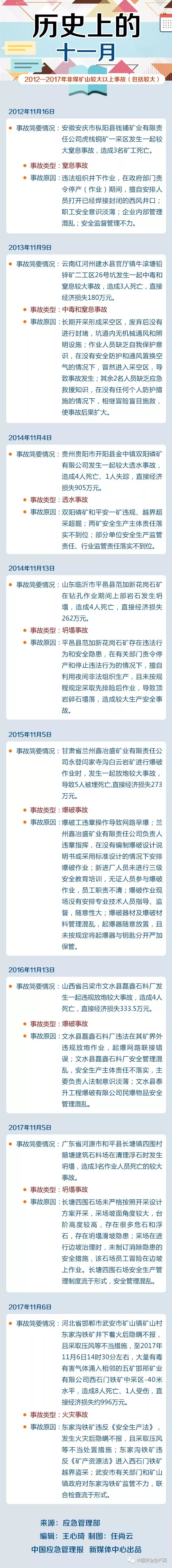 據(jù)不完全統(tǒng)計(jì),2013年-2017年11月非煤礦山發(fā)生較大以上事故(包括較大)8起,中毒和窒息、坍塌、爆破三類事故多發(fā)!