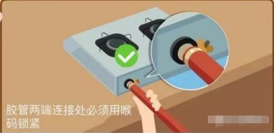 請(qǐng)使用專用燃?xì)饽z管,長(zhǎng)度不超過(guò)2米、使用時(shí)間不得超過(guò)兩年、無(wú)老化破損的情況。膠管與氣瓶減壓閥、灶具、熱水器的接口處必須加裝管箍鎖緊,防止因膠管松動(dòng)出現(xiàn)煤氣泄漏。