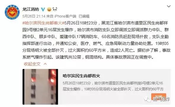 據(jù)@龍江消防:#哈爾濱民生尚都著火#5月26日18時23分,黑龍江省哈爾濱市道里區(qū)民生尚都祥園9號樓2單元16層發(fā)生爆炸,哈爾濱市消防支隊立即調(diào)派立即調(diào)派群力中隊、群西中隊、顧?quán)l(xiāng)中隊、愛建中隊17輛消防車、68名消防員趕赴現(xiàn)場撲救,支隊全勤指揮部遂行出動,并通知公安、醫(yī)療、燃?xì)狻?yīng)急局聯(lián)動力量協(xié)助處置。19時05分現(xiàn)場明火被全部撲滅,過火面積約60平方米,造成2人死亡。據(jù)初步了解,事故系燃?xì)獗ㄒ?。該建筑?2層,鋼混結(jié)構(gòu)。