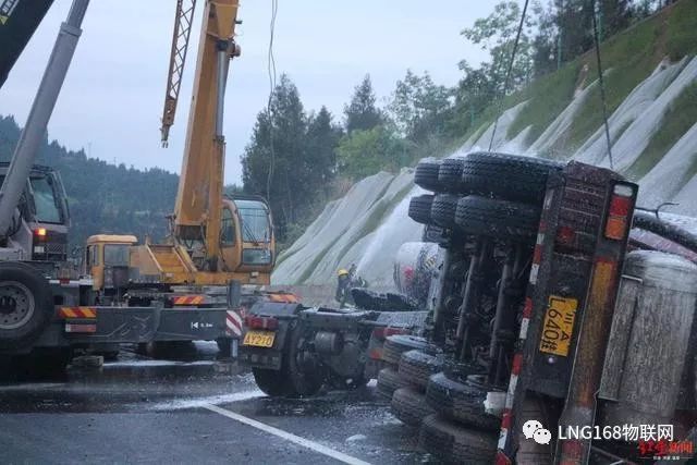 消防救援人員介紹,由于事故車輛為LNG(液化天然氣)動力,事故導(dǎo)致LNG氣罐閥門變形泄漏,且LNG儲存罐處于滿載狀態(tài),如發(fā)生爆炸燃燒后果不堪設(shè)想。根據(jù)現(xiàn)場情況,救援人員決定采取放空稀釋的方法進行處置。隨后,救援行動展開,一是高速交警立即對該路段進行封鎖,實施現(xiàn)場警戒;二是消防救援人員利用開花水槍、泡沫槍分別對氣罐泄漏點及周邊進行稀釋覆蓋,防止發(fā)生次生災(zāi)害。同時,救援人員調(diào)集大型吊車和裝載車對事故車輛進行起吊拖離。