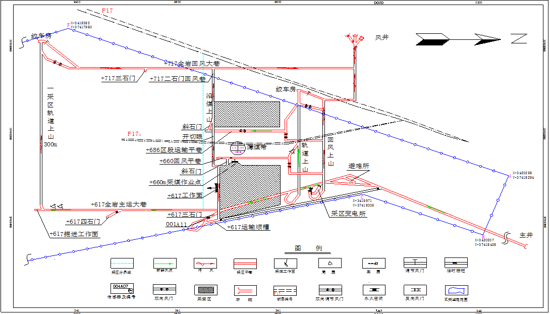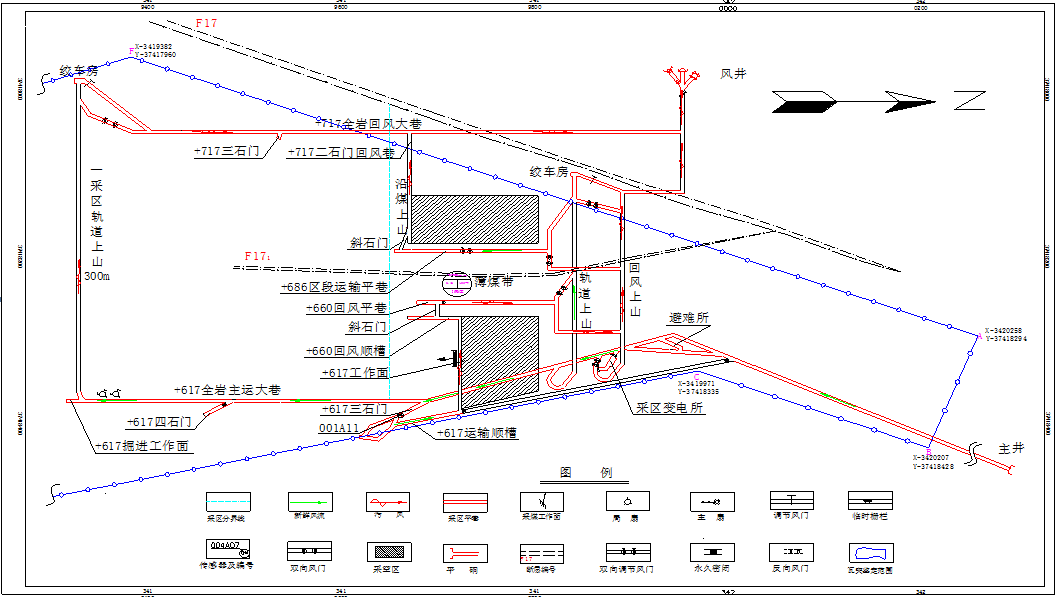 2.主要生產系統(tǒng)。礦井采用平硐上下山開拓,單水平布置。主平硐井口標高+612.73m,副井井口標高+761.70m,風井井口標高+758.94m。水平標高為+617m,劃分為4個采區(qū)。其中,+617m水平以上設置Ⅰ、Ⅱ2個采區(qū),+617m水平以下設置Ⅲ、Ⅳ2個采區(qū)(見圖1)。礦井主平硐采用CTY2.5-GGB型蓄電池電機車運輸;通風方式為中央邊界抽出式通風,風井安裝2臺FBCZ-6-№12防爆抽出式通風機,掘進工作面采用局部通風機供風;礦井為單回路供電,配備100KVA柴油發(fā)電機作為備用電源,電壓等級為660V。礦井現(xiàn)生產區(qū)域位于礦區(qū)中部F17斷層以南的Ⅰ采區(qū)。受斷層影響,Ⅰ采區(qū)北部呈一狹長塊段,礦井將該塊段劃分出來,作為邊角煤采區(qū)進行獨立回采,即+617m采煤工作面,礦井編制了《邊角煤采區(qū)設計》。