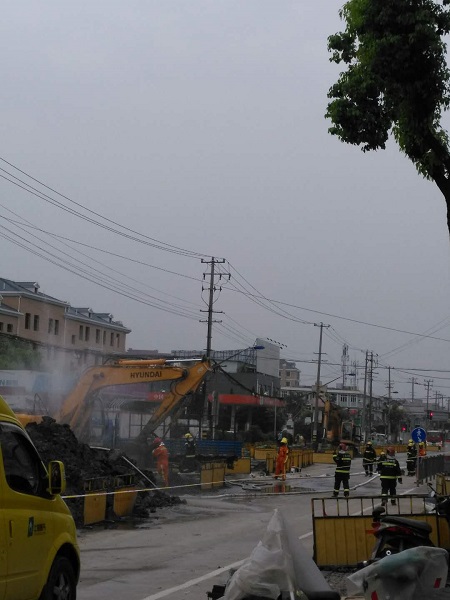 據(jù)附近市民介紹,近期,國權(quán)北路正在進行道路施工。昨天下午,一臺挖掘機在作業(yè)時,不慎將地下一根燃氣管道挖斷,頓時,大量氣體從管道內(nèi)噴出,空氣中還彌漫著一股濃烈的煤氣味。目擊者稱,管道被挖破后,現(xiàn)場噴出白色氣體,并不斷發(fā)出“嗤嗤”的聲音,工人們見狀,趕緊將挖掘機熄火。
