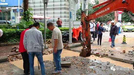 為了防止爆炸,消防部門在現(xiàn)場處置時使用了大量的水,而這些水積滿了現(xiàn)場開挖的土溝,于是,施工方準(zhǔn)備利用窨井進(jìn)行排水,看到這種情況,現(xiàn)場搶修人員趕緊喊停。