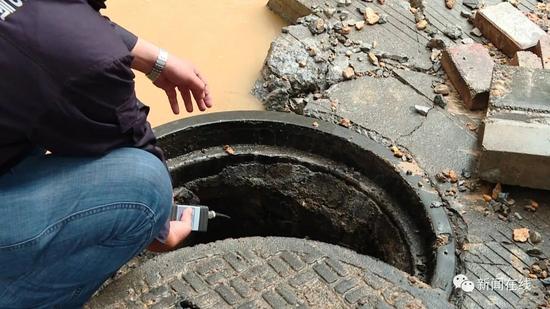 先不要敲,先不要敲,我們查一下濃度先,要不等一下(有)火花(發(fā)生)爆炸,這是雨水井啊,測一下濃度。這是雨水井,雨水井如果有氣進(jìn)去了同樣會爆炸,現(xiàn)在地下也是有,還是有是吧,等一下散了才能敲。