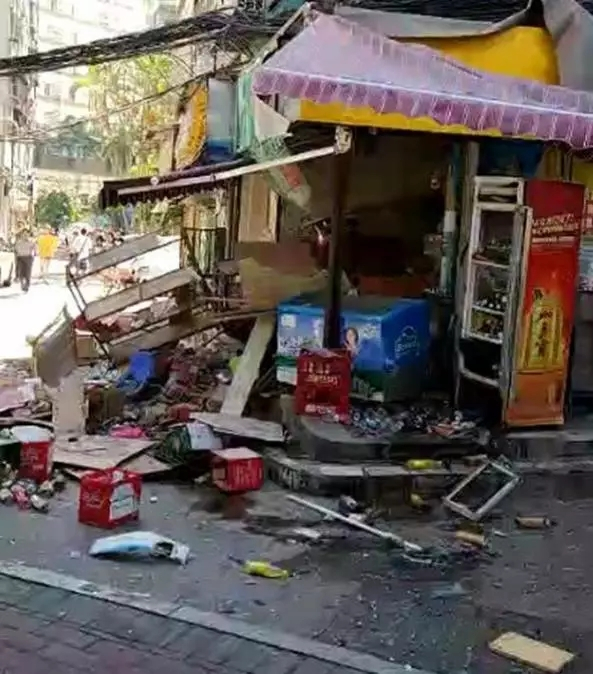 爆炸當時,士多店的墻塊、磚塊、雜物四下飛出,墻壁倒塌,甚至相隔數(shù)米之外的路邊樹葉也被震落下來,商鋪內(nèi)更是一片狼藉。